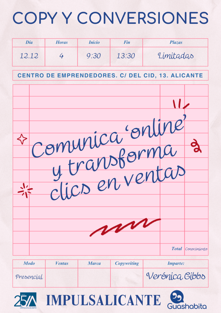 Con esa idea nace mi próxima formación «Copy y conversiones», un taller presencial de cuatro horas que impartiré el 12 de diciembre en el Centro de Emprendedores de Alicante. Un espacio diseñado para que emprendedores, creadoras, escritoras y pequeñas marcas aprendan a transformar sus palabras en energía que mueve a la acción.